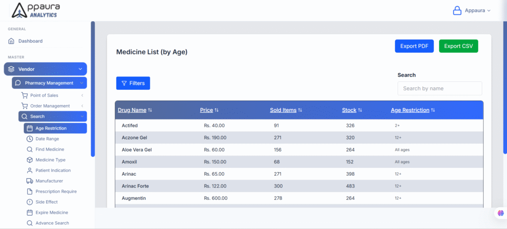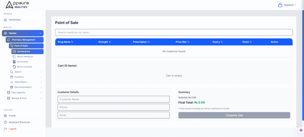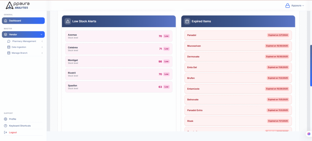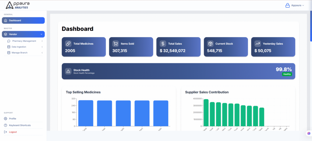 AppAura’s system solves these challenges through an integrated, automated, and data-driven approach. It allows pharmacies to monitor stock, manage vendors, and track sales performance all from one centralized dashboard. With real-time insights and analytics, pharmacies can optimize stock levels, prevent wastage, and improve overall operational efficiency.
